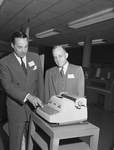 H. W. Miller Jr., left, sales manager for International Business Machines' typewriter divisions, and J. E. Russell, Southwestern district manager, look over an electric typewriter during formal opening of IBM's quarters here at 614 Texas. Published in Fort Worth Star-Telegram evening edition April 12, 1954.