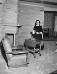 Mrs. Joe Llera, English war bride, is shown at the tea cart in her early American living room at 3821 Clayton Road West. The home is blending of modern and traditional design. Published in Fort Worth Star-Telegram morning edition April 18, 1954.