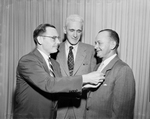 Donald S. Nelson of Dallas, left, presents a craftsmanship award to James H. Davidson, Fort Worth painter, during a dinner meeting of architects at River Crest Country Club. Herman G. Cox, president of the Fort Worth Chapter of architects, is shown in center. Published in Fort Worth Star-Telegram morning edition April 14, 1954.