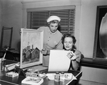 Housewives enrolled in Youth Women's College Association (YWCA) art class are enjoying their adventures in painting. Shown here is one of the students, Mrs. Lester B. Williams, right, discussing her work with her instructor, Mrs. A. C. Austermuehie. The latter is holding the painting of another student, Mrs. J. C. Echols. Published in Fort Worth Star-Telegram morning edition April 18, 1954.