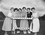 The six cinder queens will reign over the city high school track meet finals at Farrington Field. Left to right, Genevieve Williamson, Paschal; Margie Dodson, Poly; Patsy Paschall, Arlington Height; Micky Lou Owens, Carter; Ann Bates, North Side; Polly Goodger, Tech. Published in Fort Worth Star-Telegram morning edition April 15, 1954.
