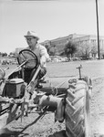 The photograph shows Oliver Shannon, driving a tractor. Published in Fort Worth Star-Telegram morning edition April 16, 1954.