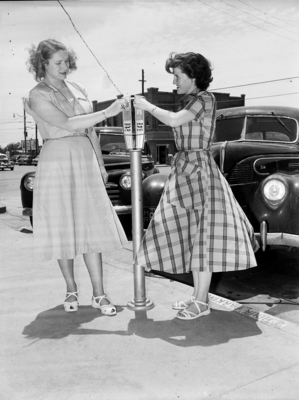 Two First National Bank employees at Grand Prairie, Miss Peggy Divelbliss, left, and Mrs. Maude Norfleet McWilliams (Mrs. Clyde McWilliams), demonstrate how Grand Prairie's new parking meters do double duty. Two teenage girls wearing dresses putting money in a parking meter. Published in Fort Worth Star-Telegram evening edition, May 20, 1950.