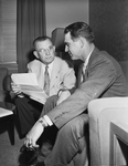 G. Curtis Clark of Corpus Christi, left, president of the Texas Grain and Feed Dealers Association, and Ben M. Ferguson of Brackett Grain Company, Fort Worth, secretary, put finishing touches on plans for the association's convention opening at Hotel Texas. Published in Fort Worth Star-Telegram morning edition April 16, 1954.