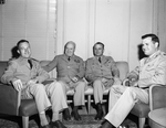 Men of the armed services put their heads together to plan a windup conclusion in Fort Worth of National Defense Week with a joint Armed Forces Day Celebration. Left to right, Commander P. W. Card, instructor of Navy reserves in Fort Worth; General Wade H. Haislip, vice chief of staff of the Army, who flew from Washington for a series of national defense talks; Major General Archie J. Old Jr., acting commander of the 8th air force during Major General Roger Ramey's inspection trip to Europe, and Captain E. D. Stevens, instructor for the Marine Corps 155-millimeter howitzer reserve battalion in Fort Worth.