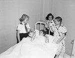 Two Camp Fire girls present to two patients of Saint Joseph's Hospital the Easter baskets Watanda Camp Fire group made for children in the hospital's pediatrics ward. The girls, left to right, are Judy Gibson, 1622 Lincoln; Donna Roach, 548 Boyce; Roxanna Deskin, 1619 Denver, and Tawana Johnson of Aledo. Published in Fort Worth Star-Telegram morning edition April 17, 1954.