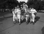 Image shows Paschal baseball team celebrating victory over Tech. From left to right, Richard Freling, Bill Baird, Ben Noey, Elton Durden, Joe Hardgrove, Emmett Taylor, Bruce Pike, Jimmy Talley and Jerry Todd. Hardgrove is being carried by his teammates. Published in the Fort Worth Star-Telegram morning edition, May 20, 1950.