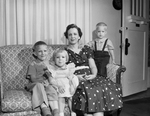Mrs. Oscar L. Morphis is pictured with her children, left to right, Steve, Sharon, and Phillip. Mrs. Oscar is newly elected chairman of Junior Woman's Club Bridge Section. Published in Fort Worth Star-Telegram morning edition April 17, 1954.