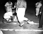 Cat First Baseman Danny Ozark grimaces in pain after suffering broken nose at La Grave Field. Pitcher, Pete Mallory is at left. Published in Fort Worth Star-Telegram morning edition April 20, 1954.