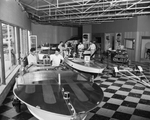 Virgal Vogt, left foreground, talks with Socrates Klidas, 1213 Jacksboro Highway, who bought the boat and motor they're inspecting. Vogt has opened a boat sales and service store at 4108 East Belknap. Published in Fort Worth Star-Telegram evening edition April 28, 1954.
