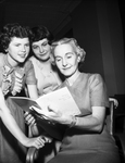 Committee meetings preceded the opening of the state meeting of the Texas Association, Future Homemakers of America. Looking over the program here are, left to right, Louise Wright of Hooks, state fourth vice president, and Miss Mildred Carter of Olton and Mrs. Blanche Phillips of Woodville, both local chapter sponsors. Published in Fort Worth Star-Telegram evening edition April 22, 1954.