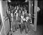 A small section of Boy Scouts scurry out of the Worth Theater to start their downtown ticket selling invasion. Tickets are for the scouting in Action Exposition to be held May 7-8 at Will Rogers Exhibit Building. Five hundred scout attended a pep rally before starting the ticket sales. Proceeds aid Worth Ranch. Published in Fort Worth Star-Telegram April 25, 1954.