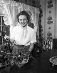 Mrs. Norbert A. Zehnder, 2504 Stadium, waters one of her favorite African violets, "Blue Warrior." Another favorite in her collection of approximately 1,000 plants is one with a white blossom and purple center. Published in Fort Worth Star-Telegram morning edition April 23, 1954.