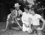 Tarrant County's poultry judging team won first place in fourth district 4-H Club contests held at Arlington State College. Talking with their coach, John E. Burleson, assistant agricultural agent for Tarrant County, are, left to right, Wayne Rhine, 16, Gerald Winnett, 15, and Claude Pairsh, 14. Boys are members of the Crowley 4-H Club. Published in Fort Worth Star-Telegram morning edition April 24, 1954.