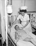 Jerry Vaughn, 7, as well as two of his brothers, has hemophilia, a bleeding disease. Here, City-County student nurse Hazedean Hibbard watches Jerry during a transfusion. Published in Fort Worth Star-Telegram morning edition April 24, 1954.