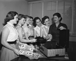 Members of Xnials Club, social service organization for high school girls, presented a recording machine to the Foundation for children with visual disability. Shown, left to right, presenting the machine to Miss L. Frances Smith, right, are Misses Mary Pool, Shirley Brown, Linda Blazi, Nancy Green, Darlene Albert, and Connie LaRue. Published in Fort Worth Star-Telegram morning edition April 24, 1954.