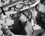 Sergeant Dan Saulter of Boyd is shown at his gunner's position inside one of the big tanks of Company B, 249th Tank Battalion, at Eagle Mountain National Guard Base, ready to fire either the 90-mm canon or a heavy machine gun. Both are fired through the $10,000 gunsight into which he is looking. Published in the Fort Worth Star-Telegram evening edition June 25, 1954.