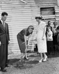 Mrs. G. H. Crow, president of the Woman's Missionary Union of the Tarrant Baptist Association, turned the first shovel of dirt for the union's Good Will center. Awaiting her turn with the shovel is Mrs. Eugene Crosier. Published in Fort Worth Star-Telegram morning edition April 25, 1954.