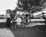 Mr. and Mrs. Otto Monnig, standing, pause for a chat with Mrs. Cecil Ray, seated at left, and Mrs. Rufus Brown, visitors to the Monnig garden at 3835 Winslow during the Fort Worth Garden Club's spring garden pilgrimage. Published in Fort Worth Star-Telegram morning edition April 25, 1954.