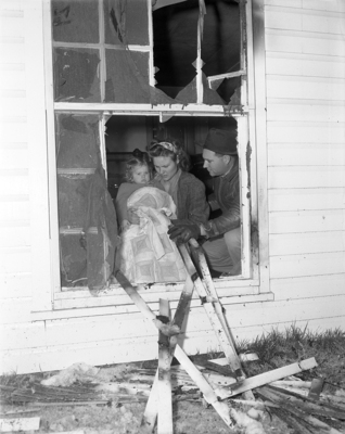 Framed in a window of their ruined home at 4005 Gilmore, O. Stegall, his wife and their daughter, Sandra Sue, above, survey the damage done by a gas explosion that blew windows out of their home and started a fire that forced them into the sleet. A broken glass window of a building with a man, woman, and female child.