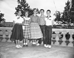 This quintet of champions gave Alice Carlson a near-sweep in elementary school tennis tournament. Left to right, Ethel Wiley and Judy Hagood, girls' doubles, Mary Ann Kerr, girls' singles, and Ronald Hunter and Jack Freeze, boys' doubles. Published in Fort Worth Star-Telegram morning edition April 26, 1954.