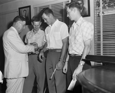 Sheriff's Deputy R. H. Stone clamps shut handcuffs linking three Cats baseball players charged with "base stealing" in a mock ceremony. Left to right, Stone, Russ Rose, Dee Fondy and Don Hoak. Published in Fort Worth Star-Telegram, May 20, 1950.