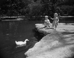 Brice Townsend, 2, and Mary Tad Tandler, 1, try to coax the ducks in Trinity Park onto the bank. They are the children of Mr. and Mrs. Townsend III and Lieutenant and Mrs. Tyler W. Tandler of Carswell Air Force Base. Published in Fort Worth Star-Telegram evening edition April 26, 1954.