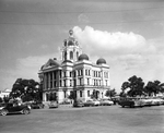 The Coryell County courthouse, rising above the city square, dominates any view of downtown Gatesville. Figures of Justice holding the scales are distinctive features. Published in Fort Worth Star-Telegram morning edition May 2, 1954.