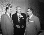 Participants at the opening day program of the National Retail Dry Goods Association's credit management division were, left to right, J. Gordon Dakins, executive vice president of the NRDGA, Theodore H. Silbert, president of Standard Factors, and S. C. Patterson, general credit manager of Winkelman Brother Apparel, Inc. Published in Fort Worth Star-Telegram morning edition April 27, 1954.