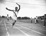 Dan Gurly hits tape to give Daggett victory in 440-yard relay at junior high school track meet at Farrington Field. Published in Fort Worth Star-Telegram evening edition April 28, 1954.