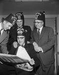 Four members of the Moslah Temple Shrine circus committee study the route they will take in their talent search for the 1954 Shrine circus. Left to right standing are R. M. Stovall, chairman, Dr. B. W. Garrison, and Houston P. Hutchens. Potentate Paul L. Hamilton is seated. Published in Fort Worth Star-Telegram morning edition April 28, 1954.