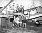 Fort Worth sailors help load nine Dogies on a truck for a trip to the Shreveport Regatta. Standing in front of the boat being hoisted are, left to right, Jimmy Loveless, Marilyn Loveless, Kathy Hardin and Ginger Smith. Behind the boats are Simms Hardin, Bart Loveless and Kathy Terrell. On the truck are Stanley Durham, Mike Bickel and Tommy Lipscomb. Published in Fort Worth Star-Telegram evening edition April 29, 1954.