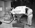 Tommy Watson of Mansfield mans the regular black-and-white television camera at left for comparison with the new $66,000 color camera operated by Art Runyon at 4232 Strong. Two of the big instruments arrived at the WBAP-TV studios in Meadowbrook last week, and others are on the way. Published in Fort Worth Star-Telegram morning edition April 28, 1954.