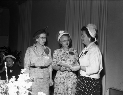 Miss Ethel Seaholn of Austin, (left), was elected president of the Lone Star Council of Credit women. Mrs. Pat Hughes of Birmingham, Alabama, (center), was the international president of Credit Women, and Mrs. Beulah Oborski of Beaumont, right, was the retiring president of the council. Unidentified women can be seen in the lower left side of the image. Published in the morning edition, May 22, 1950.