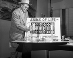Sheriff Harlon Wright is shown here with visual aids for a traffic safety campaign known as "Signs of Life," which his office is conducting with participation by Fort Worth police, for city and county school children. In the foreground is a model traffic intersection. The other device is an electric board depicting warning signs. Published in Fort Worth Star-Telegram morning edition April 29, 1954.