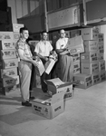 Three members of Morningside Lions Club unpack light bulbs their club will package and sell to raise funds for club house property. They are, left to right, Raymond Waters, A. J. Waters, and Dr. William E. Spain. Published in Fort Worth Star-Telegram morning edition April 29, 1954.