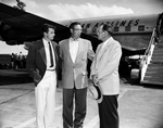 Abb Curtis, right, assistant executive secretary of the Southwest Conference, greets USC Track Coach Jess Motenson, center, and Quarter miler Jim Lea on the Trojans' arrival at Amon Carter Field. USC will be involved in a triangular meet at Dallas. Published in Fort Worth Star-Telegram evening edition May 1, 1954