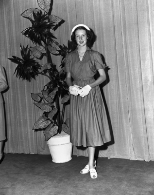 Miss Pat Curry of Pantego was chosen at the annual County 4-H Girls Revue to represent Tarrant County at the Texas 4-H Round Up in College Station. The style show was held at Cox's auditorium and included the participation of 56 girls from ages 10 to 16 who modeled dresses that they made themselves. Published in the morning edition, May 22, 1950.