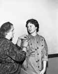 Mrs. L. A. Woods, chairman of Girl Homemakers, Texas Society of the Daughters of the American Revolution, pins a DAR medal on Evelyn Rockett, 14, who won first place in the state DAR school sewing contest. Published in Fort Worth Star-Telegram morning edition April 30, 1954.