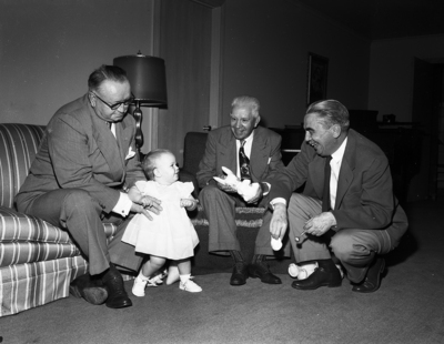 Two fond Grandfathers, Dr. R. L. Grogan, left, and Hubert Hammond Crane, right, are show with their granddaughter, little Julia Lee Crane, while great-grandfather, George Starkey, looks on. Published in the morning edition, June 18, 1950.