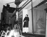Workmen were repairing window damage at Monnig's Friday morning after glass was shattered by strong winds. Published in Fort Worth Star-Telegram morning edition April 30, 1954.