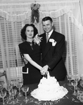 Newlyweds Mr. and Mrs. W. A. Blakeley, married at the bride's home at 1513 South Jennings, are shown cutting their wedding cake. Mrs. Blakeley is the daughter of Mrs. E. D. Beck of Gainsville, and Mr. Blakeley is the son of Mr. and Mrs. E. G. Blakeley of Lake Worth. The couple would go on to live at the South Jennings address following their return from a trip to Galveston Texas. Published in the morning edition, May 25, 1950.