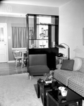 This view of Miss Gwen Harvey's apartment shows the room divider between the living room and the dining area. The two coffee tables in the foreground were made by Miss Harvey, and the bookcase on which the telephone sits was built by a former roommate. Published in Fort Worth Star-Telegram morning edition May 18, 1954.