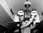 Jack McCarthy, Santa Fe general yard master, inspects the kerosene lamps in one of the two antique coaches in which 50 persons will make the trip . Published in Fort Worth Star-Telegram morning edition May 2, 1954.