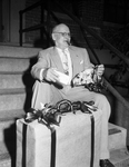 The photograph shows B. F. (Wildcat) O'Connor with the suitcase and cigars he got on retiring from M-K-T service after 24 years. Published in Fort Worth Star-Telegram morning edition May 1, 1954.