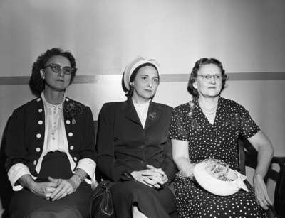 The Communications Club held its third annual homecoming dinner party at the Centennial Room of the Hotel Texas. Past presidents and former members were honored at the occasion. Mrs. Mildred Wilson Britton was the club's first president in 1936, others that followed her were Miss Eva Tannahill, Miss Annie Laura Anderson, and others. Images shows Mrs. Annie Laurie Anderson, Miss Eva Tannahill, and Mrs. Mildred Wilson Britton sitting left to right. Published in the morning edition, May 21, 1950.