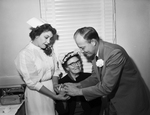 Mrs. Mary Bowden, center, became the first patient at the new Azle Clinic and Hospital. Her injury was a cut finger. Dr. W. B. McElroy and Mrs. Kathleen Waits, clinic nurse, delayed dedication ceremonies while they bandaged the wound. Published in Fort Worth Star-Telegram morning edition May 2, 1954.