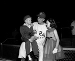 Larry Randlett, 7, left and Linda Randlett, 9, confer with Cat Pitcher Carroll Beringer over their membership in the Knothole Gang, which will take place at La Grave Field game. Published in Fort Worth Star-Telegram morning edition May 13, 1954.