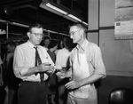 Horace M. Jewell, left, receives a 40-year journeyman printer's membership button from Roger Vinson on behalf of the International Typographical Union. The ceremony was in a chapel at the Star-Telegram, where Jewell is composing room foreman. Vinson is a 31-year veteran and former chapel chairman for 15 years. Published in Fort Worth Star-Telegram morning edition May 3, 1954.