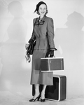 Gloria Williams travels to a mountain resort in a bright red linen suit trimmed with navy piping by Edith Small and matches her outfit with blue leather wardrobe bag and train case by Oshkosh. A woman wearing a suit and holding luggage. A woman in a coat and dress. Published in Fort Worth Star-Telegram morning edition, May 28, 1950.